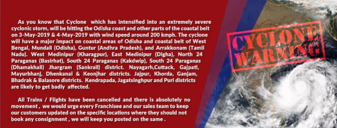 印度受热带气旋"Fani"影响,印度ANDHRA PRADESH 和 WEST BENGAL 等沿海地区遭受暴雨和洪水,派送和转运会有延误。WEST BENGAL部分地区甚至因此而没有网络和电力,签收反馈慢,由此造成的部分区域的转运以及派送延误还请谅解